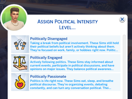 Your Sim’s political behavior is tracked and nudges them toward a compatible political trait. For example, a Sim who frequently protests, donates to charity, and discusses wealth redistribution may start leaning toward a more progressive or socialist identity.