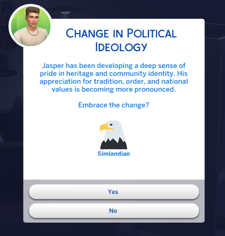 Once a strong enough pattern emerges, the Sim will experience a “Self Discovery” moment, receiving a political trait and related buffs.