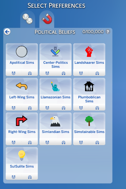 2. I see prefrences only have a left, right and center option, prehaps you could also include "Political Opinions" as a way to add in some more nuance behind a sim's beliefs, such as a Progressive sim who is also supportive of Firearms or a more Conservative sim who is more open to the LGBT+. Opinions could be tied to specific topics, specific sims or specific actions which would also affect a sim's mood and prehaps choosing a prefrence that is normally contradictory to whatecer the alignment normally has it as, the prefrence takes priorty.